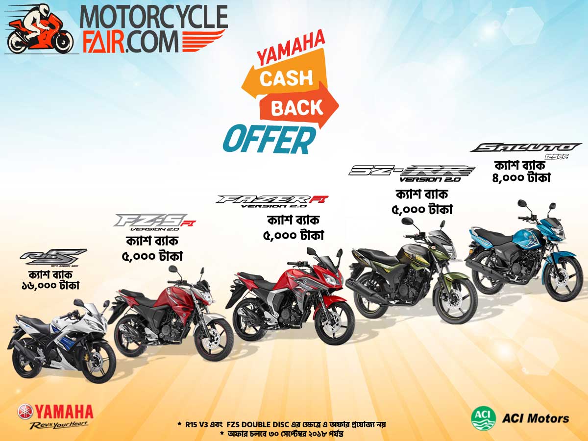 Yamaha SZRR V2, Yamaha FZS FI V2 ও Yamaha FAZER FI V2 কিনলে পাবেন ৫,০০০ টাকা ক্যাশ ব্যাক এবং